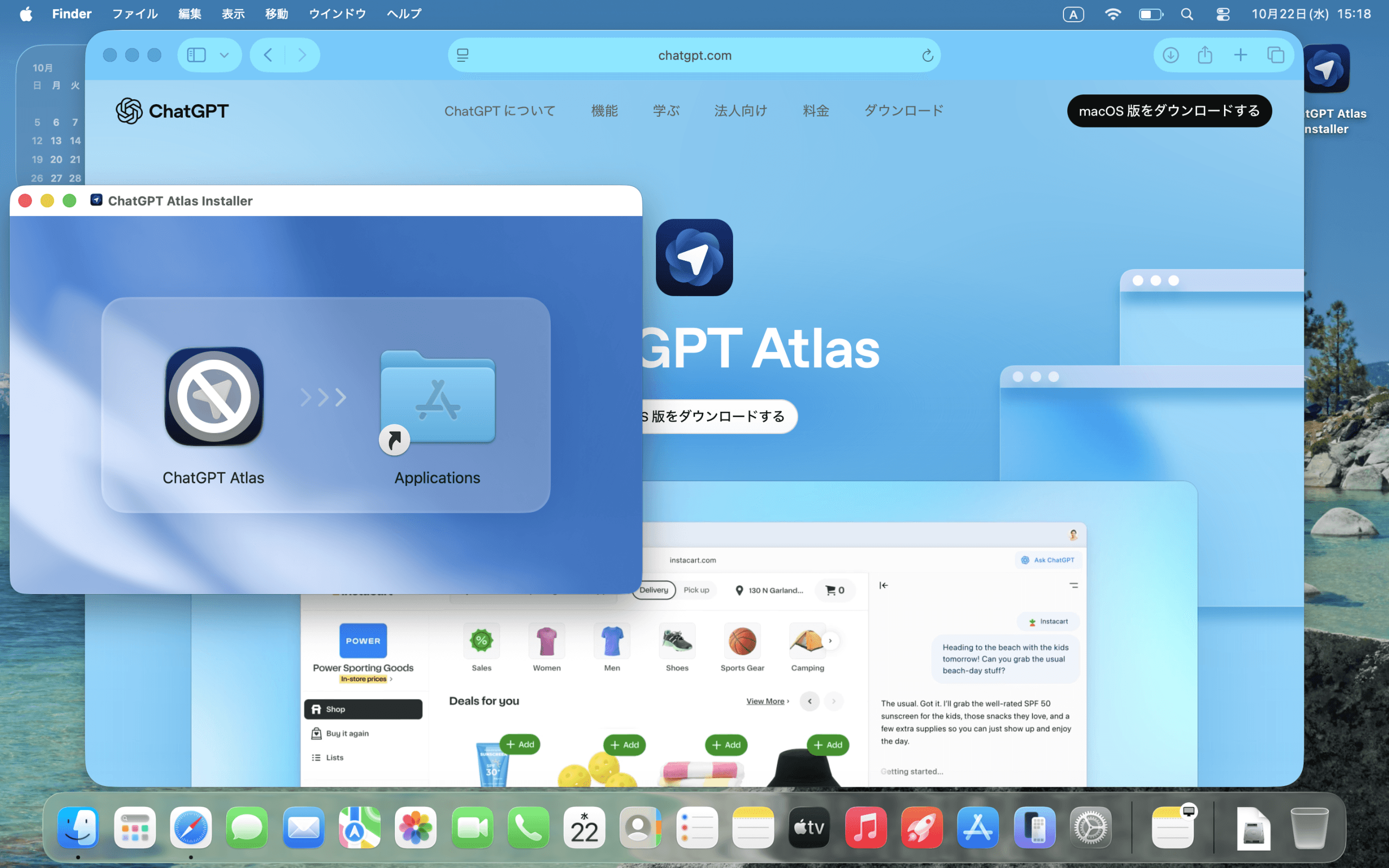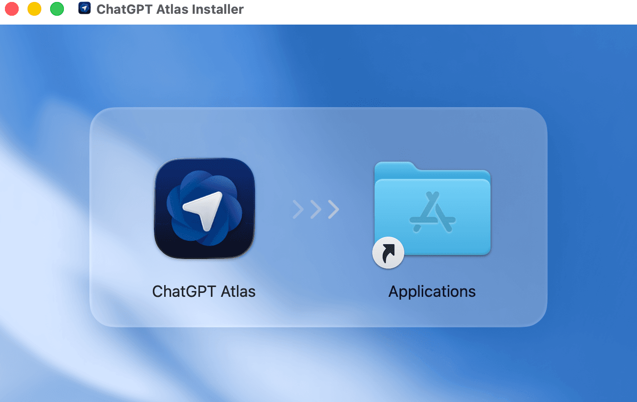 ChatGPT Atlas Installerが開いたら「ChatGPT Atlas」のアイコンを「Applications」にドラッグする。