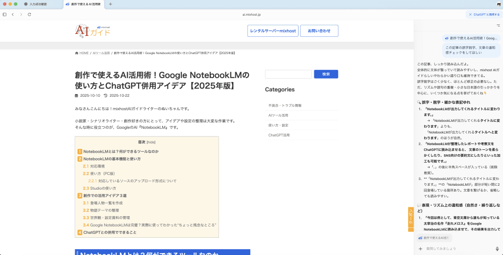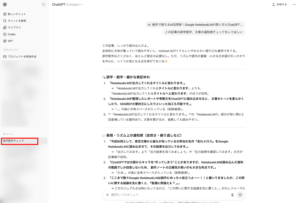 このサイトのURLを入力し、以前の記事「創作で使えるAI活用術!Google NotebookLMの使い方とChatGPT併用アイデア【2025年版】」を開き、ためしに「ここの記事の誤字脱字、文章の違和感チェックをしてほしい」と入力してみると、