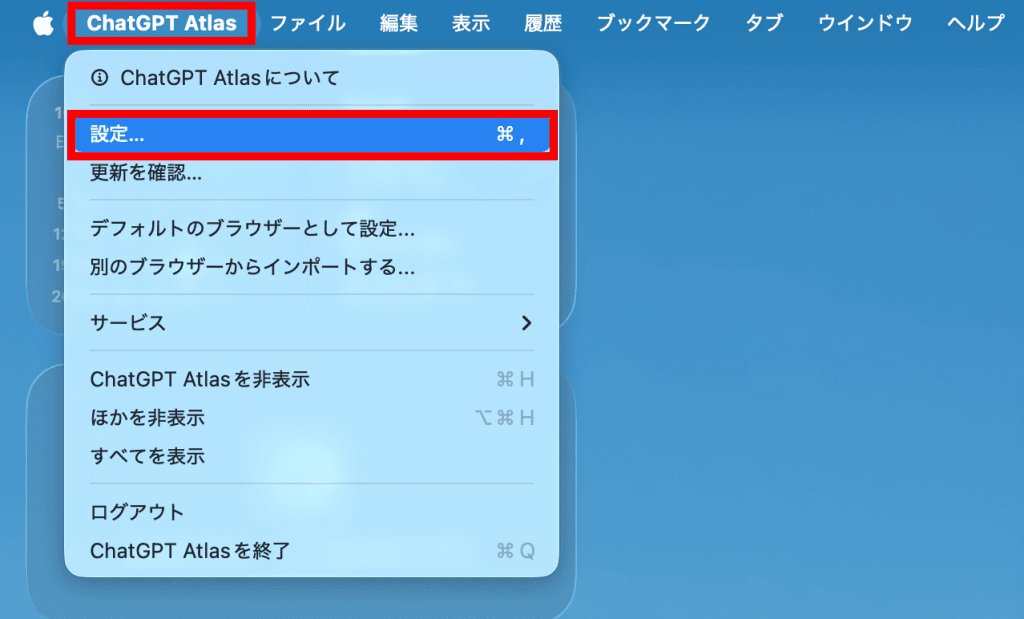 赤枠で囲んだ「ChatGPT Atlas」→設定をクリック
