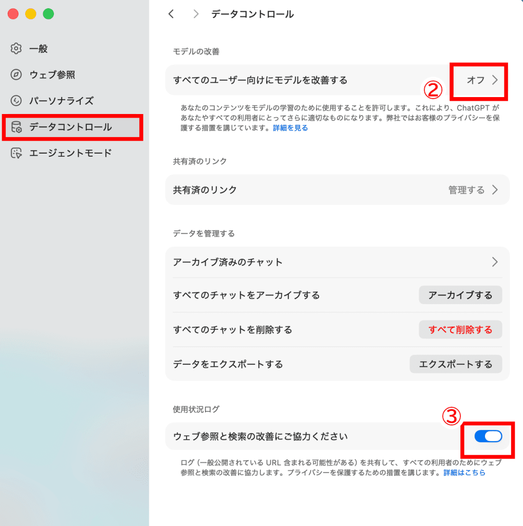 「データコントロール」内の「すべてのユーザ向けにモデルを改善する」と「ウェブ参照と検索の改善にご協力ください」の項目がオフになっているか確認しておきましょう。