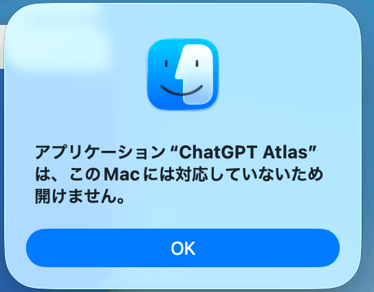 アプリケーションを起動しようとすると「アプリケーション"ChatGPT Atlas"はこのMacに対応していないため開けません」というメッセージが出てきます。