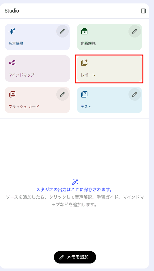 下の4つはGoogle NotebookLMが読み込んだソースを元に自動生成されたおすすめのレポート形式です。