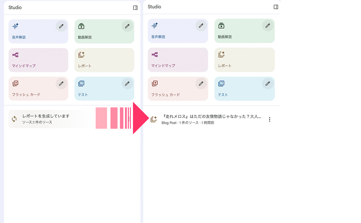 NotebookLMの“Studio”機能では、読み込んだ資料をもとにAIが考察や要約を自動生成してくれます。いわば「AIによる作品の読書感想文機能」です。