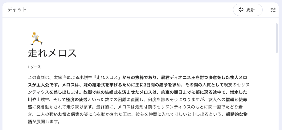今回は例として、青空文庫から誰もが知っている太宰治の名作「走れメロス」をGoogle NotebookLMに読み込ませて、その結果を出力してみます。
