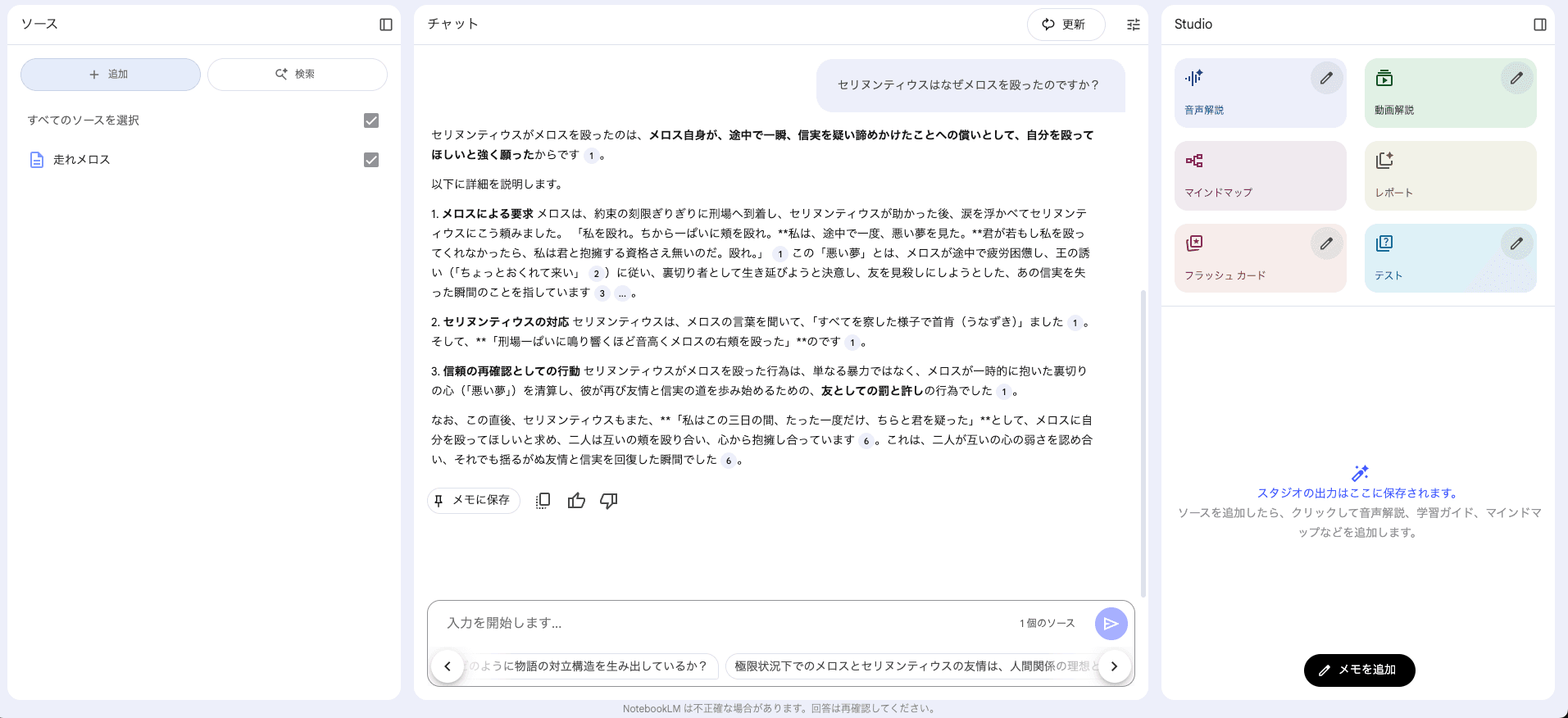 画像のように、「セリヌンティウスはなぜメロスを殴ったのか?」と自分で回答を入力することもできますし、NotebookLM側がソースを読み込んだ上で質問を用意してくれます。