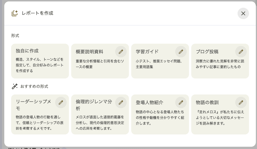 「リーダーシップメモ」や「倫理的ジレンマ分析」など、楽しそうな考察テーマを提案してくれます。 - しばらく待っていると「レポートを作成しています」という表示がNotebookLMが出力してくれるタイトルに変わります。
